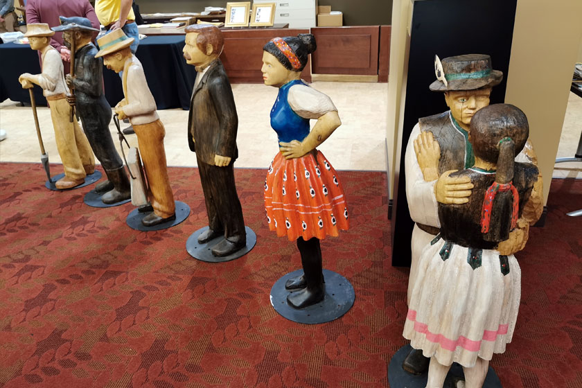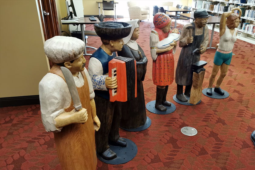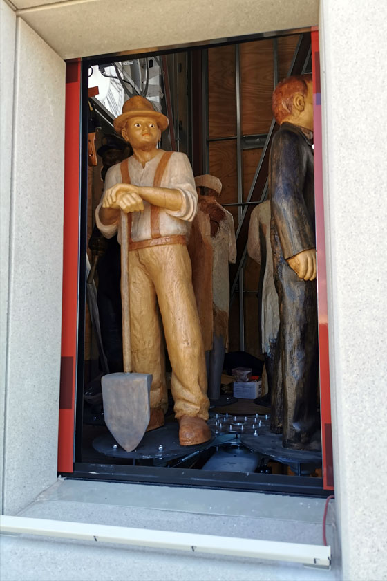 Slovo příběh je klíčové a vine se celou rekonstrukcí věže. Orloj musí být Česko–Slovenský stejně jako muzeum, takže sochy by měl vyrobit někdo na Slovensku. Osloven byl sochař Andrej Haršány. Příběh zažíná – orloj bude z Čech, sochy ze Slovenska. Sochy mají také každá svůj příběh. Stejně jako na pražském orloji je 6 soch ve dvou oknech, ale na rozdíl od pražského orloje tyto sochy představují buď řemeslo (řezník, kovář, ledař, horník, sedlák, obchodník) nebo kulturní činnost (tanečníci, akordeonista, tanečnice-dívka v kroji) nebo běžný život (jeptiška-učitelka, matka s dítětem, sokolka). Každou sochu „adoptoval“, tedy přispěl na ni, někdo z potomků původních přistěhovalců. Dnes už málokdo ví proč byli ledaři, ale právě potomci ledařů tu stále žijí a na sochu přispěli.